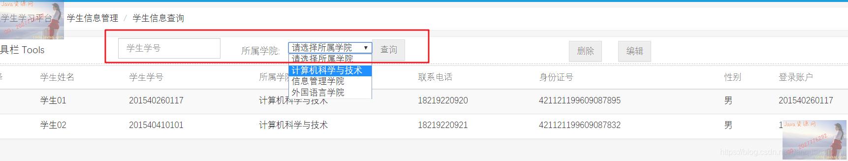 学生信息查询(根据“学生学号”或者“所属学院”进行筛选)